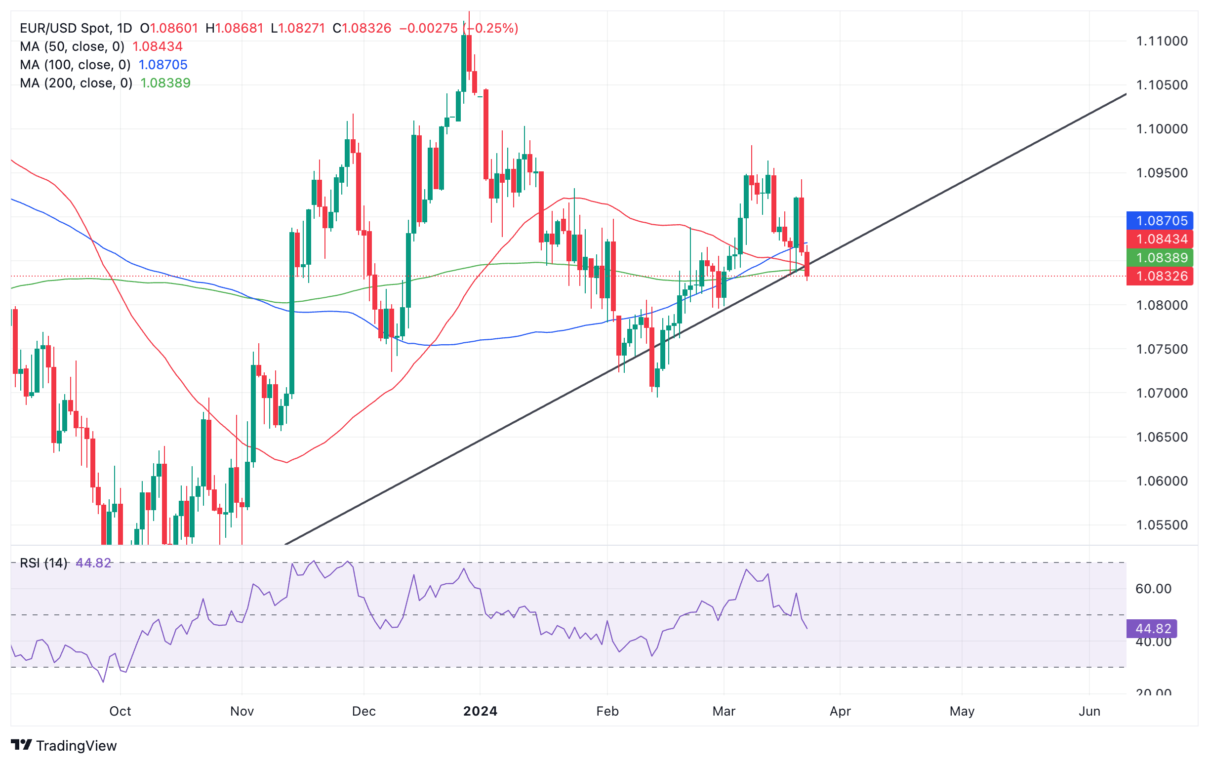 欧元/美元周五下跌近0.5%,位于1.0800s的低位,低于200日简单移动平均线(SMA),此前德国央行行长约阿希姆·内格尔(Joachim Nagel)表示,欧洲央行(ECB)可能会在夏季休会前降