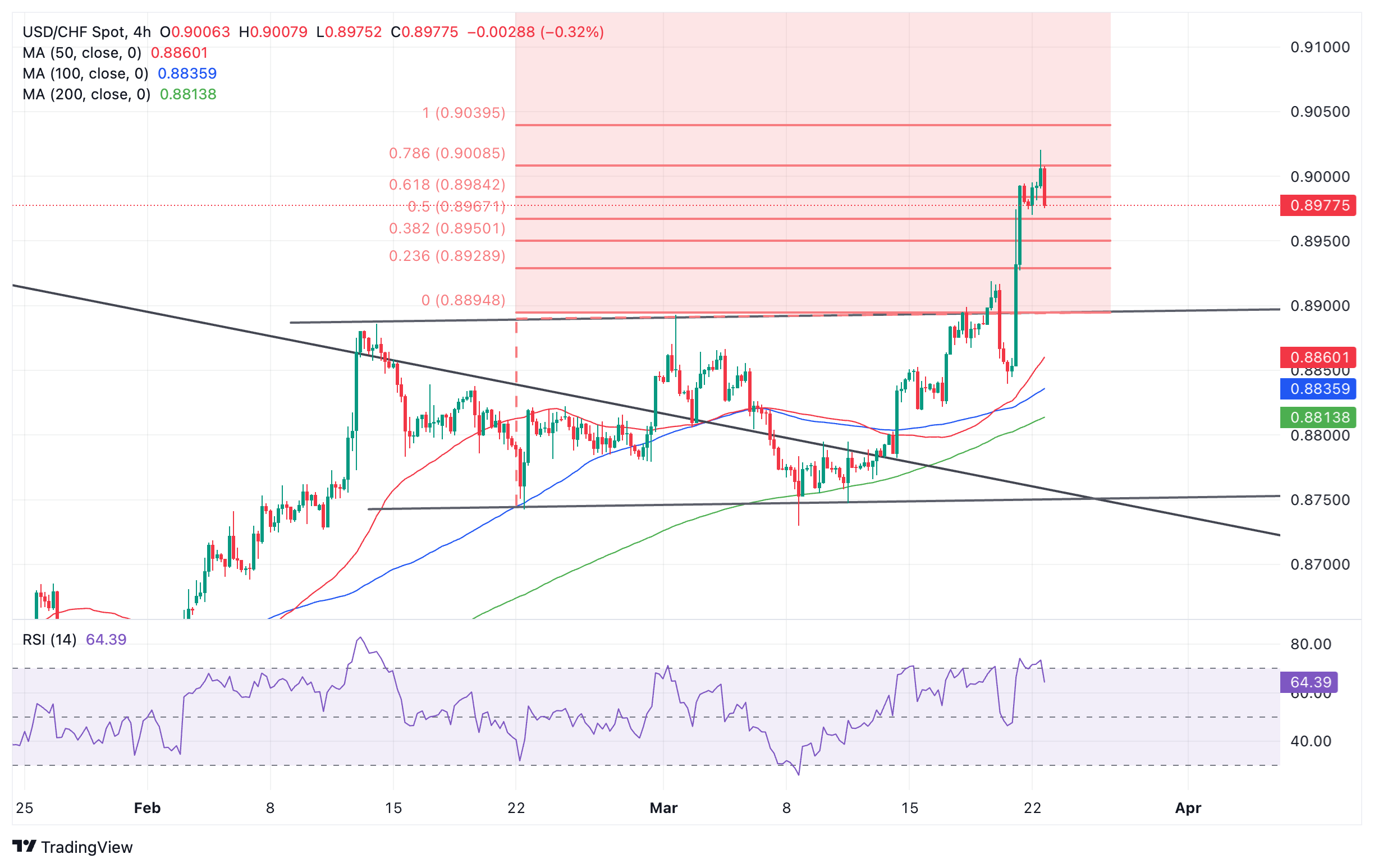 美元兑 瑞郎突破了自情人节以来一直徘徊的区间顶部,反弹走高,目前交投于 0.8900 上方。