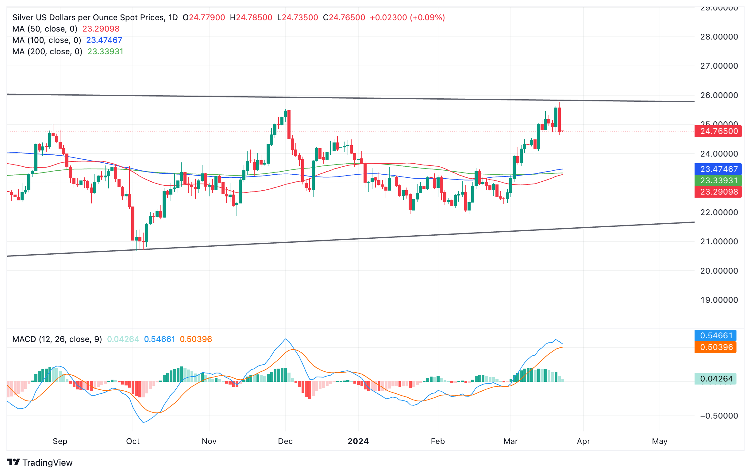 白银价格分析:白银/美元触及区间顶部并反转走低