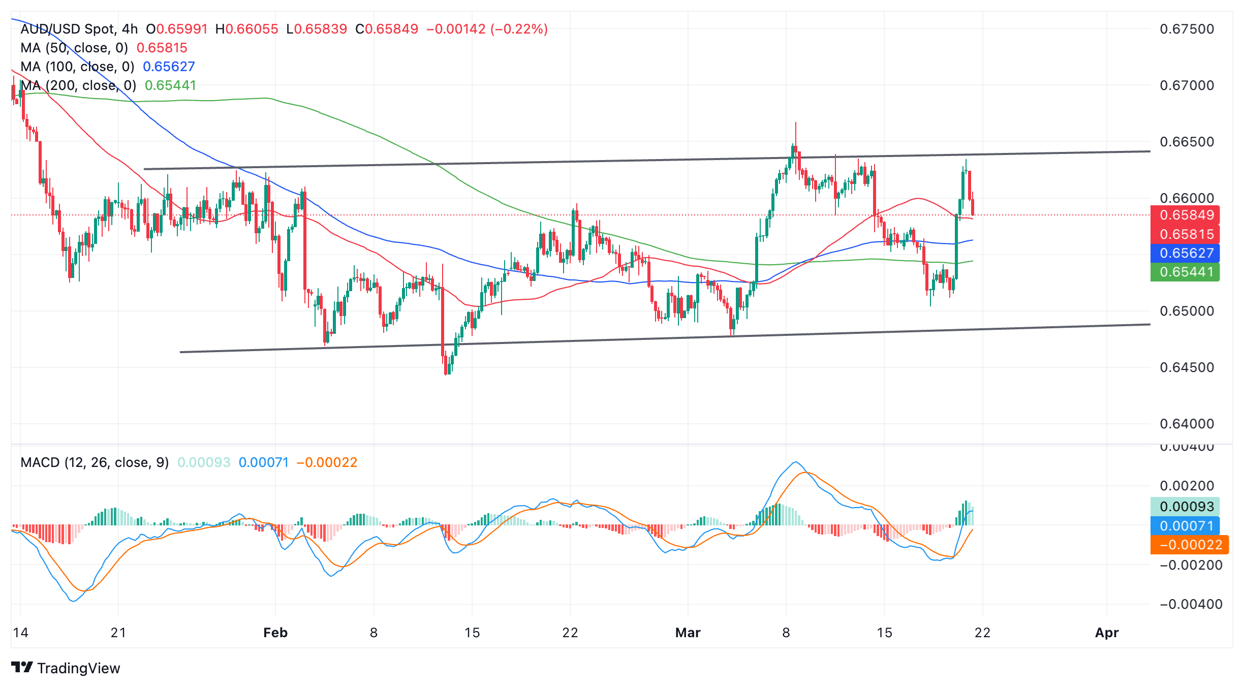 周四美国时段,澳元/美元在日内低点回落,此前一系列相对强劲的美国数据帮助美元(USD)收复失地。