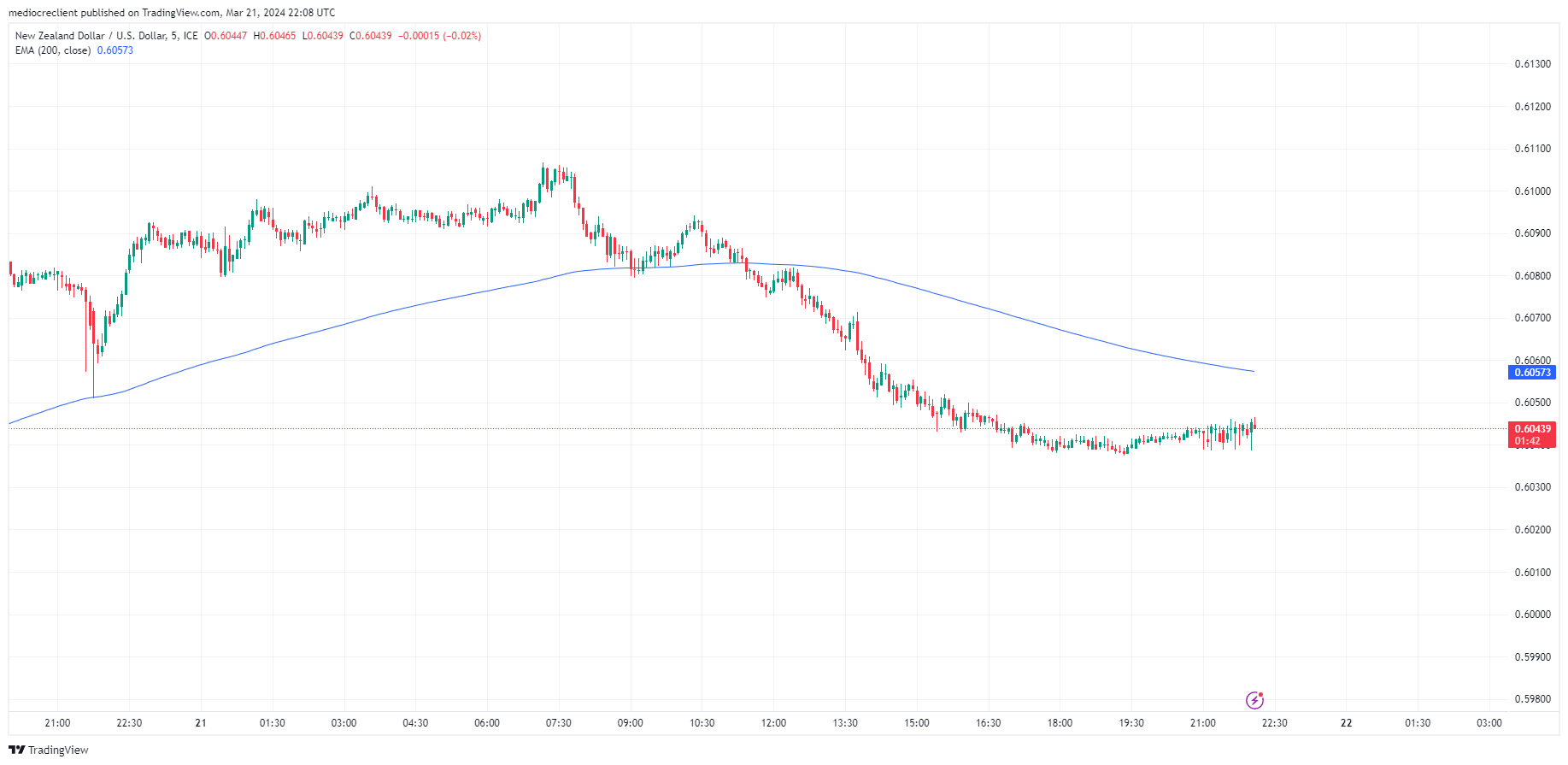 周四纽约时段早盘,纽元/美元回吐日内涨幅,转为下跌。由于美元从五日低点 0.6060 大幅反弹,纽元/美元回落。由于美联储(Fed)上调了 2024 年美国国内生产总值(GDP)预测,美元指数(DXY