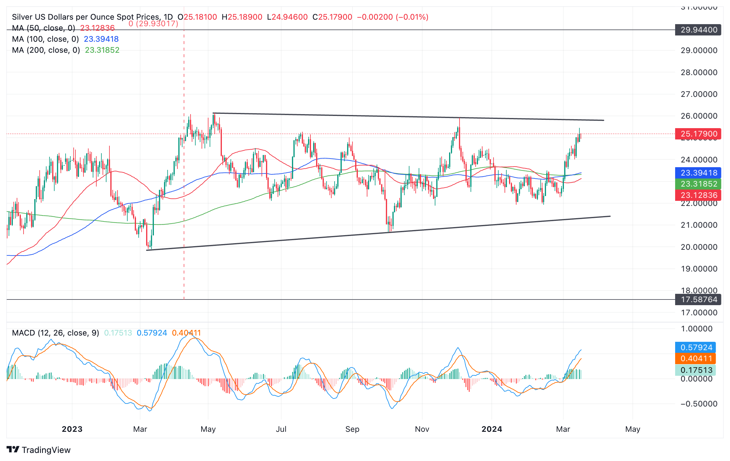 银价(XAG/USD)在本周初出现回调,在接近长期区间的顶部后交投于 25.10 美元附近。回调可能是由于对未来利率走势的预期发生了变化,现在预计美国利率将在更长时间内保持较高水平。