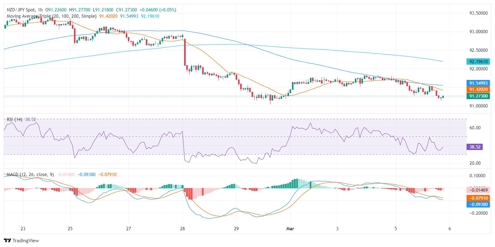 周二盘中,纽元/日元目前报 91.26,下跌了 0.45%,空头立场坚定。也就是说,市场总体情绪仍然不明朗。虽然看跌势头明显,但纽元/日元处在关键的简单移动均线(SMA)上方,表明总体看涨倾向持续存在