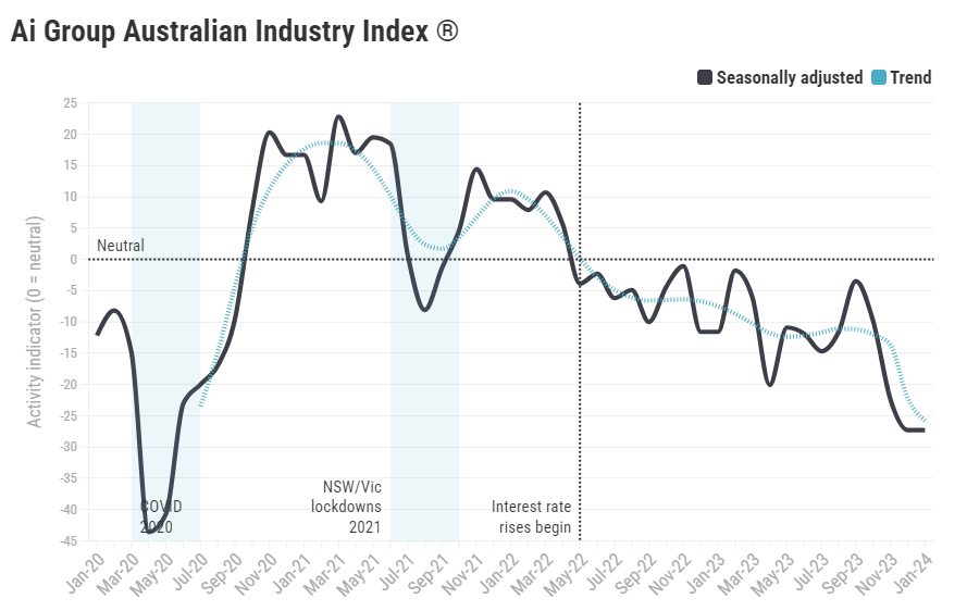 澳大利亚工业集团(AiG)发布的最新一月份工业指数显示,澳大利亚经济表现有所回暖,但仍深陷收缩区间,为-14.9,而上个月为-27.3。