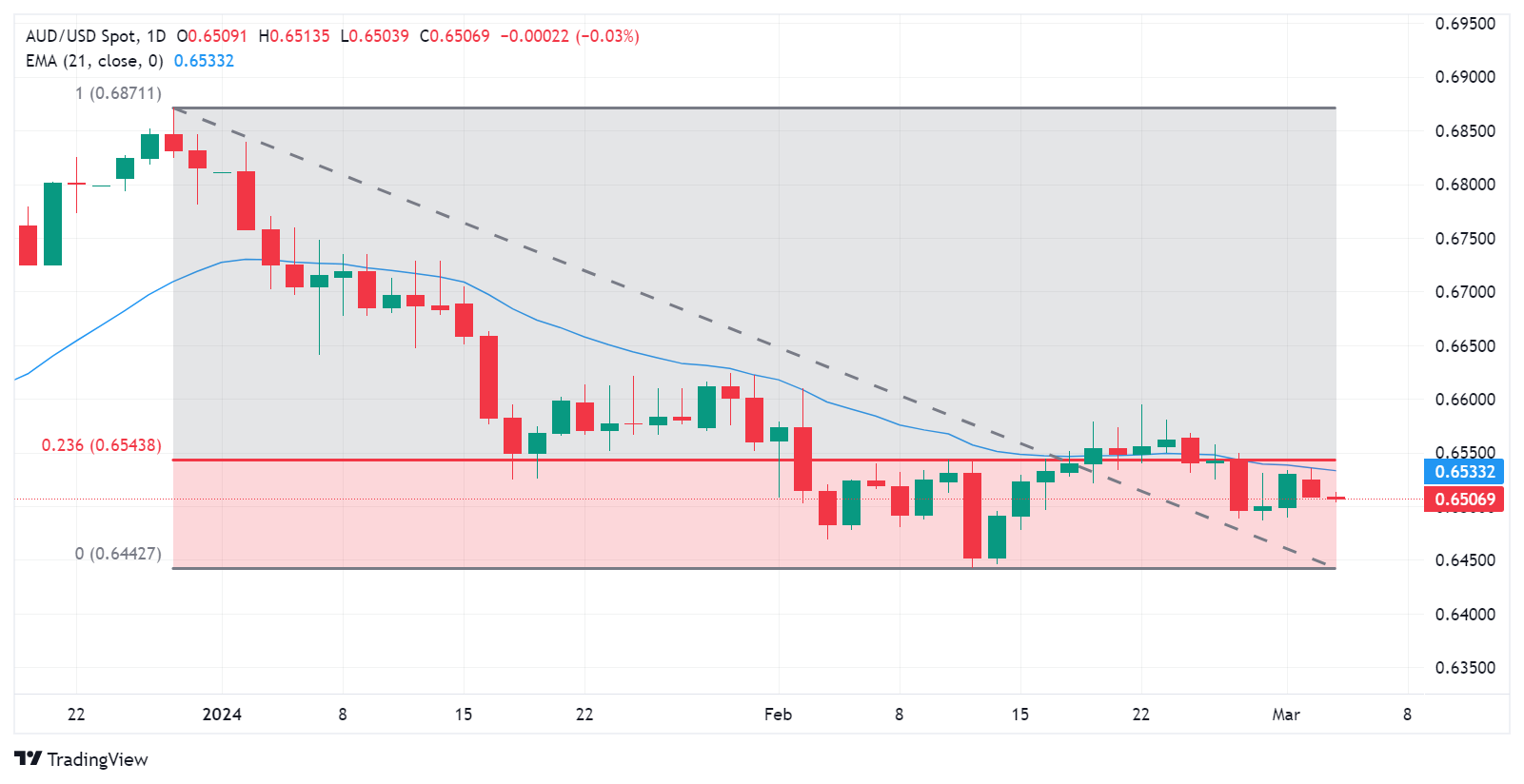 周一亚洲时段早盘,澳元/美元在0.6500中位下方震荡走弱。尽管美元(USD)和美国收益率走低,但澳元/美元还是失去了牵引力。在美国非农就业数据(NFP)公布之前,投资者正在等待澳大利亚第四季度 国内