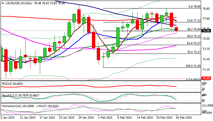 WTI原油价格于周一早些时候进一步下跌,延续上周五2.2%的跌势,因为高于预期的美国通胀数据可能推迟美联储降息。 油价多次上行受阻且周图未能收盘于重要的斐波那契回档阻力78.13美元(95.00/67