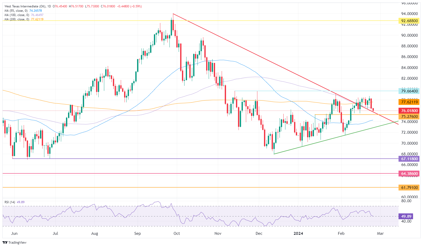 需求低迷、仓位缩减,WTI 油价回落至 76 美元