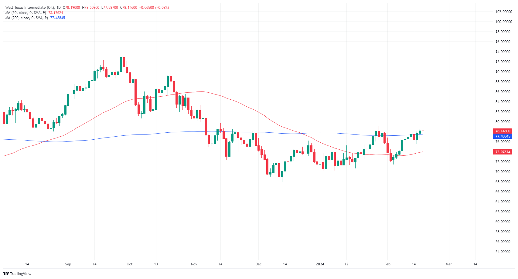 周一,美国西德克萨斯中质原油(WTI)测试 78.00 美元上方,在美国市场因美国总统日假期休市市场淡静的情况下获得上行空间。