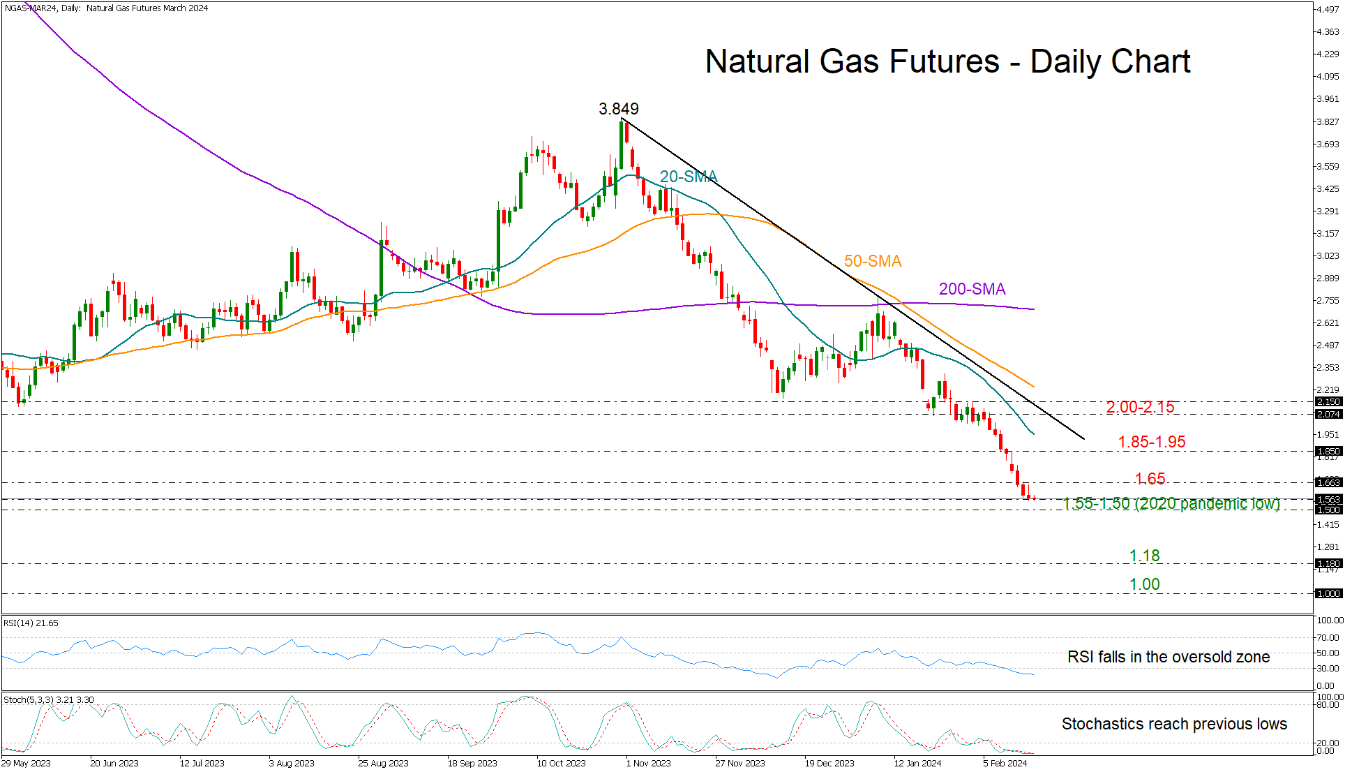 3月天然气期货价格又经历了痛苦的一周,跌向新冠病毒疫情低点1.50美元,也这是2014-2016年下降趋势线所在。 RSI和随机指标出现超卖状况,而周四的蜡烛线(似乎是一根倒转锤子线)增强了价格可能