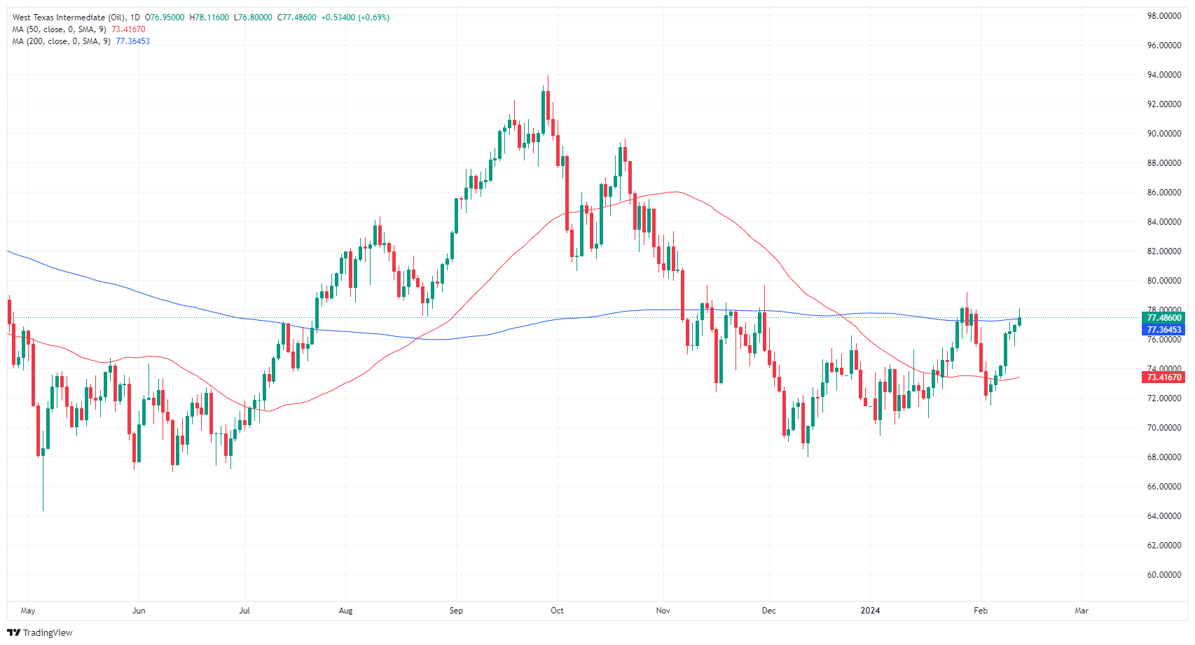 美国西德克萨斯中质原油(WTI)周二连续第七天攀升,测试 78.00 美元关口,随后企稳于 77.40 美元附近。地缘政治紧张局势继续支撑原油,但美国原油供应过剩拖累能源市场,同时美国消费者物价指数(