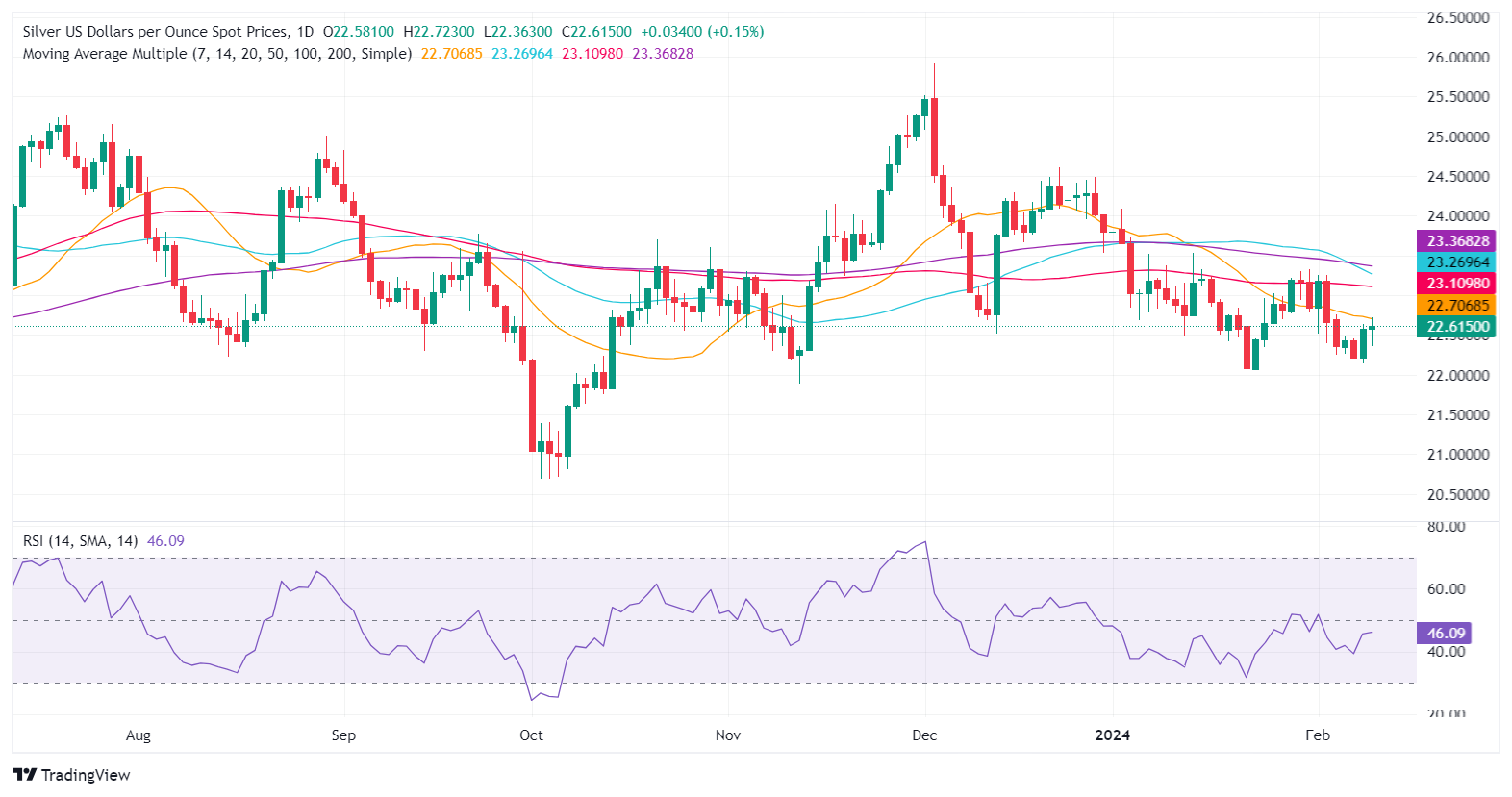 尽管美国国债收益率攀升,但上周五银价仍录得 微幅上涨0.15%。也就是说,美元仍在下跌,这对银价是一个利好因素,银价在从 22.37 美元的低点跳升后,目前交投于 22.60 美元。 银价呈下行趋势
