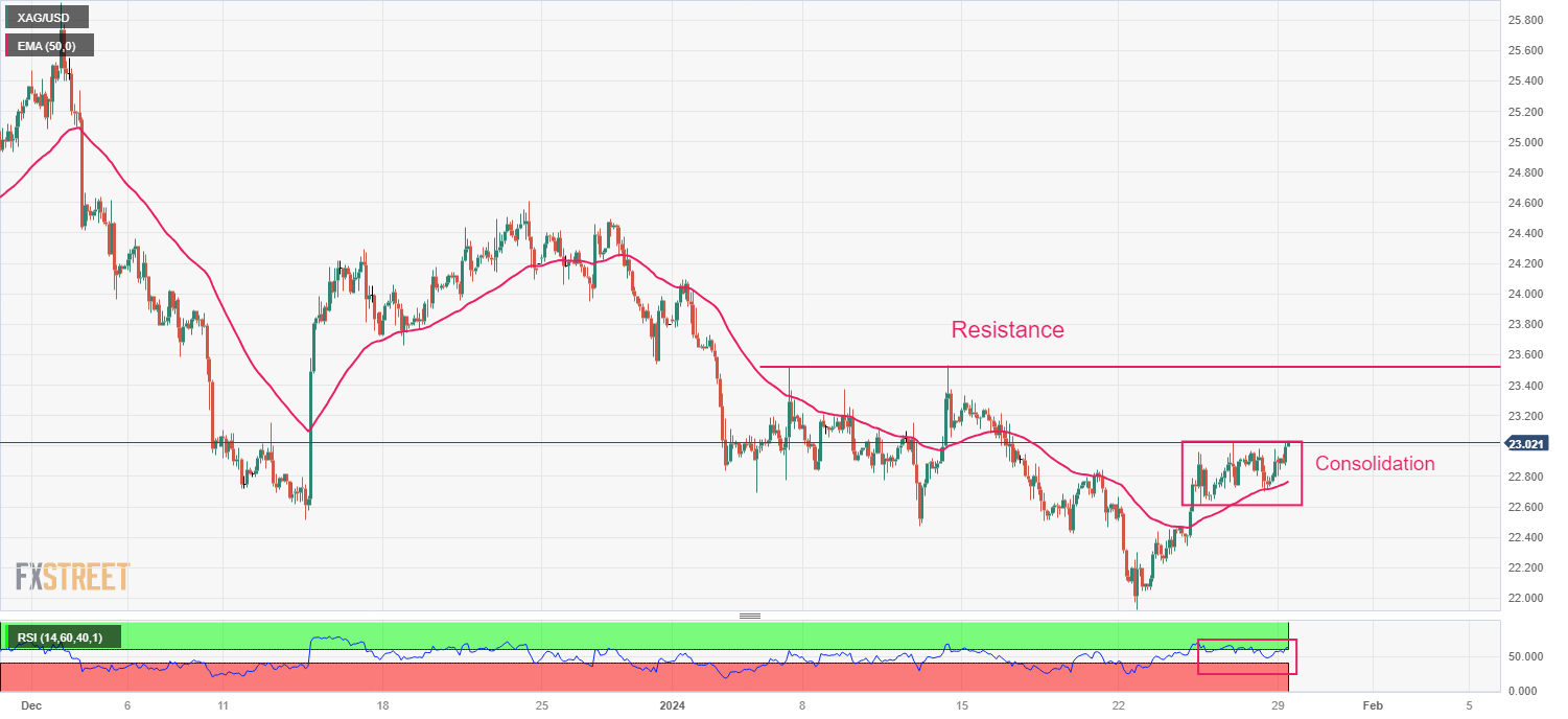 由于地缘政治冲突加剧改善贵金属的吸引力,银价(白银/美元)跃升至每盎司23美元附近。由于中东危机恶化导致波动性加剧,该白色金属出现巨大买入兴趣。 驻扎在约旦东北部的三名美国军人在一次无人机空袭中丧生