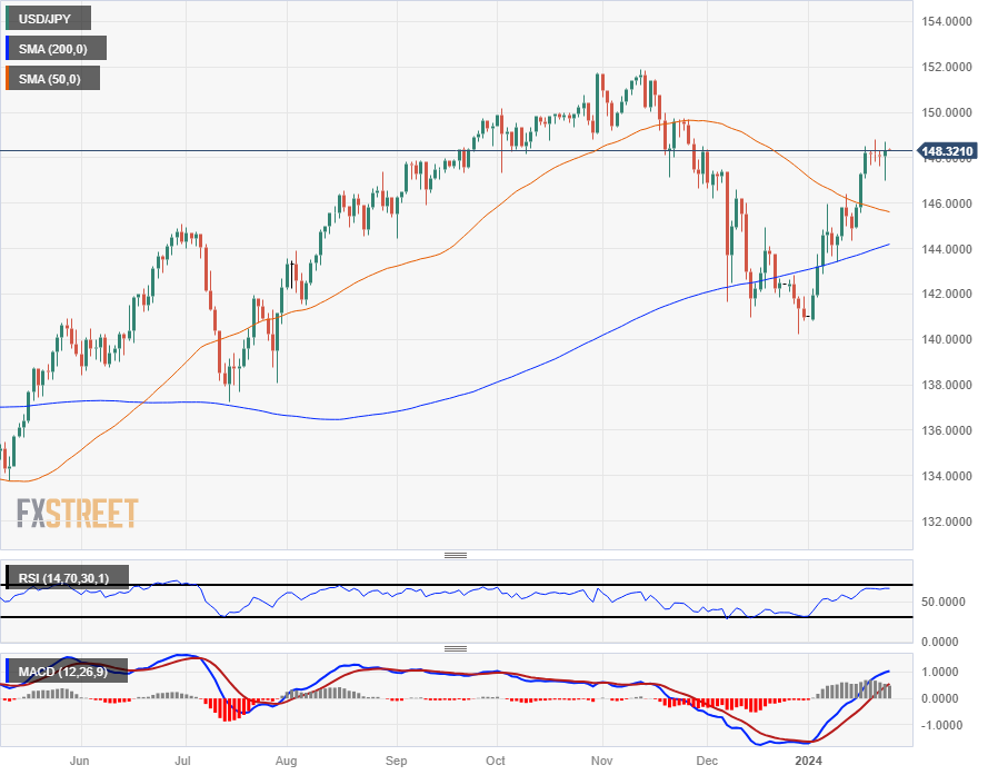 美元/日元触及熟悉的买入水平148.70,整个周二市场追捧美元(USD),使得日元当日全盘走低。 日本央行决定出现更多的迹象表明通胀不再出现强于预期的进一步回落之前,会将政策利率锁定在负值-0.1%