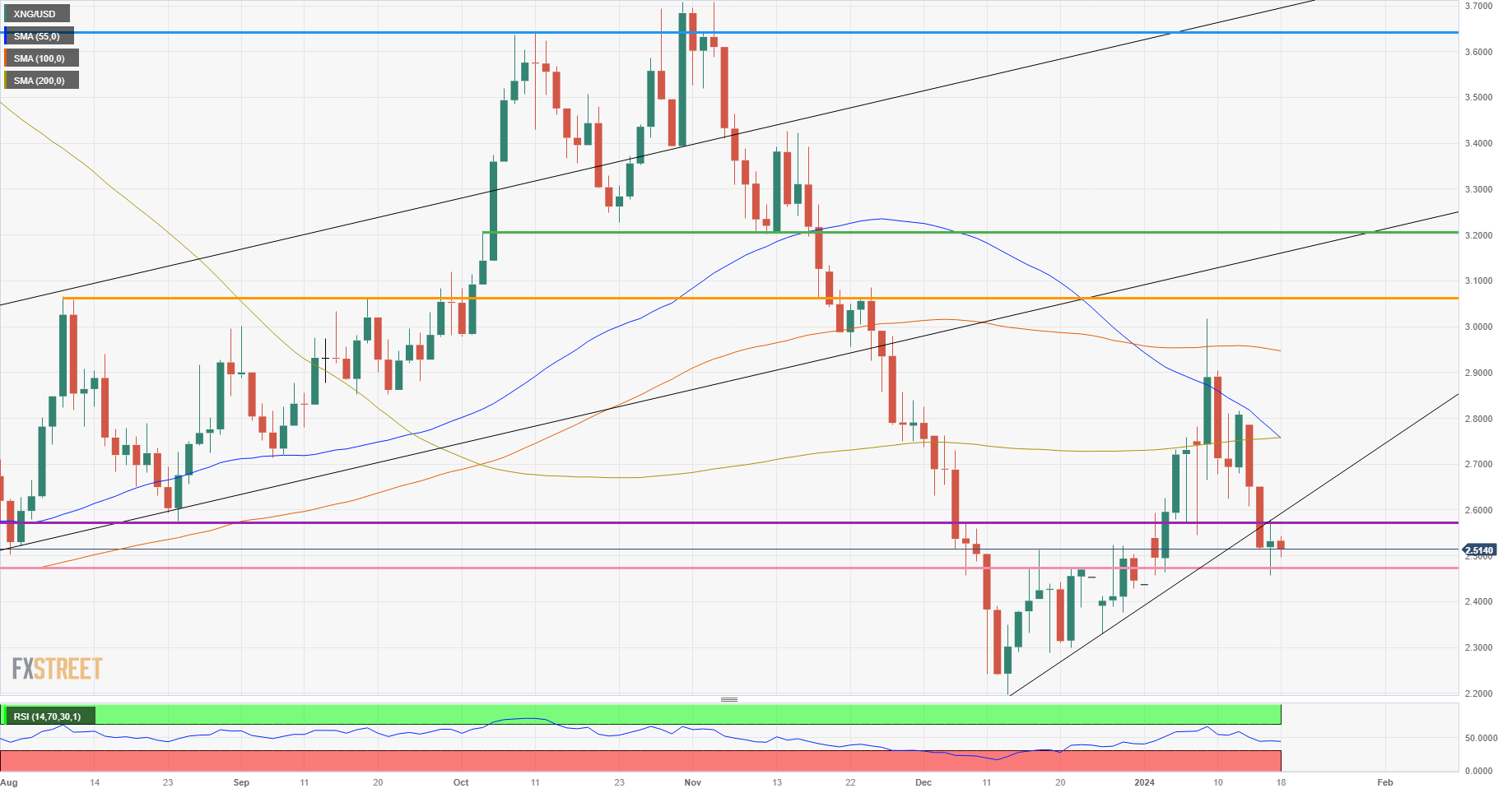 天然气(XNG/USD)在本周大幅下跌后脱离低点。尽管供应仍然非常稳固和充足,但有几个因素开始令交易商担忧。最大的因素是也门的紧张局势升级,红海发生了更多袭击事件,伊朗袭击了巴基斯坦境内。 与此同时