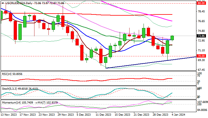WTI原油价格在周四早些时候进一步上涨,延续周三3.5%的涨幅,录得11月17日以来最大涨幅。 利比亚最大的油田之一被关闭导致基本面恶化,以巴战争引发的紧张局势加剧,这些都抬高了油价。 美国原油库存降
