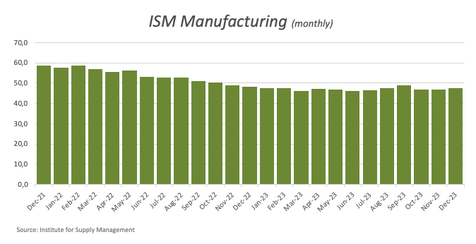12 月份,制造业的经济活动连续第二个月扩张。ISM 制造业采购经理人指数从上月的 46.7 升至 47.4,超过了市场一致预期的 47.1。 数据还显示,ISM 制造业就业人数从 45.8 升至