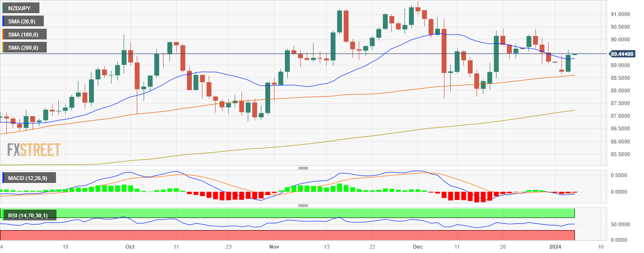 周三盘中,纽元/日元上涨了 0.70%,上涨至 89.40。日线图上出现不明朗走势,暗示中性至轻微看涨势头,过去五天中四天下跌,随后获得喘息。尽管纽元/日元出现了上扬,但就短期而言,四小时图指标已经走