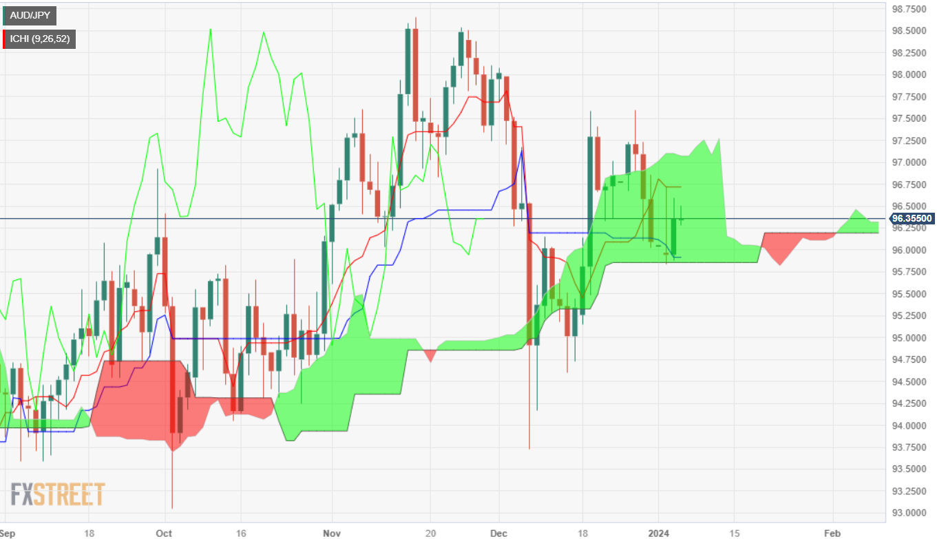 澳元/日元周三的涨幅有所放缓,上涨0.46%,但周四开盘时有所回落,处在昨日收盘价 96.42下方。不过,买方突破基准线,并在一目均衡表云图底部附近介入,这为进一步上涨打开了大门。发稿时,澳元/日元交