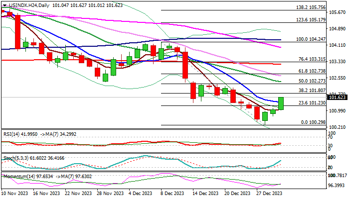 美元指数在2024年第一个交易日走高,延续自五个月低点100.30(12月28日)以来的反弹行情,为第三日上扬。 交易员从更广泛的下跌中获利了结,推动美元价格走升并缓解短期下行威胁,焦点转向欧元区通胀