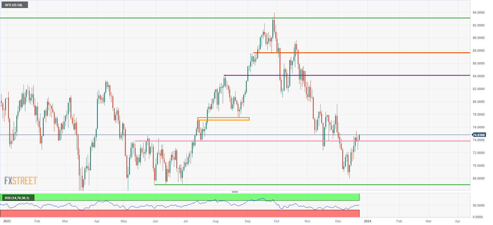 WTI原油在圣诞节前波动剧烈的一周内重回74美元上方。 安哥拉周四宣布将于一月份退出欧佩克。 美元指数 DXY 逼近大幅破位,可能抹去半年来的涨幅。 在红海地缘政治紧张局势的推动下,