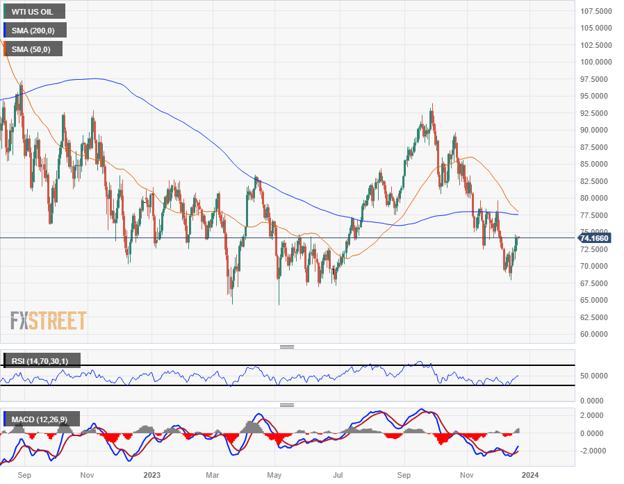 西德克萨斯中质原油(WTI)正在试图积聚上行势头,即使原油供应线受到轻微限制,因为也门胡塞叛军在红海袭击了几艘船只后,几家公司暂时中止了通过红海航道的原油运输。 胡塞叛军誓言将继续袭击通过曼德海峡的