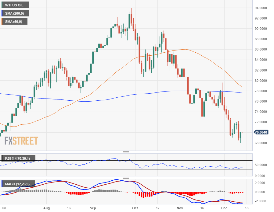 WTI油价正试图在每桶 70 美元附近获得支撑。由于能源市场普遍担心全球原油需求下滑将继续削弱石油输出国组织(OPEC)的减产力度,原油价格的持续回落使WTI油价跌至 68 美元附近。 美国能源信息