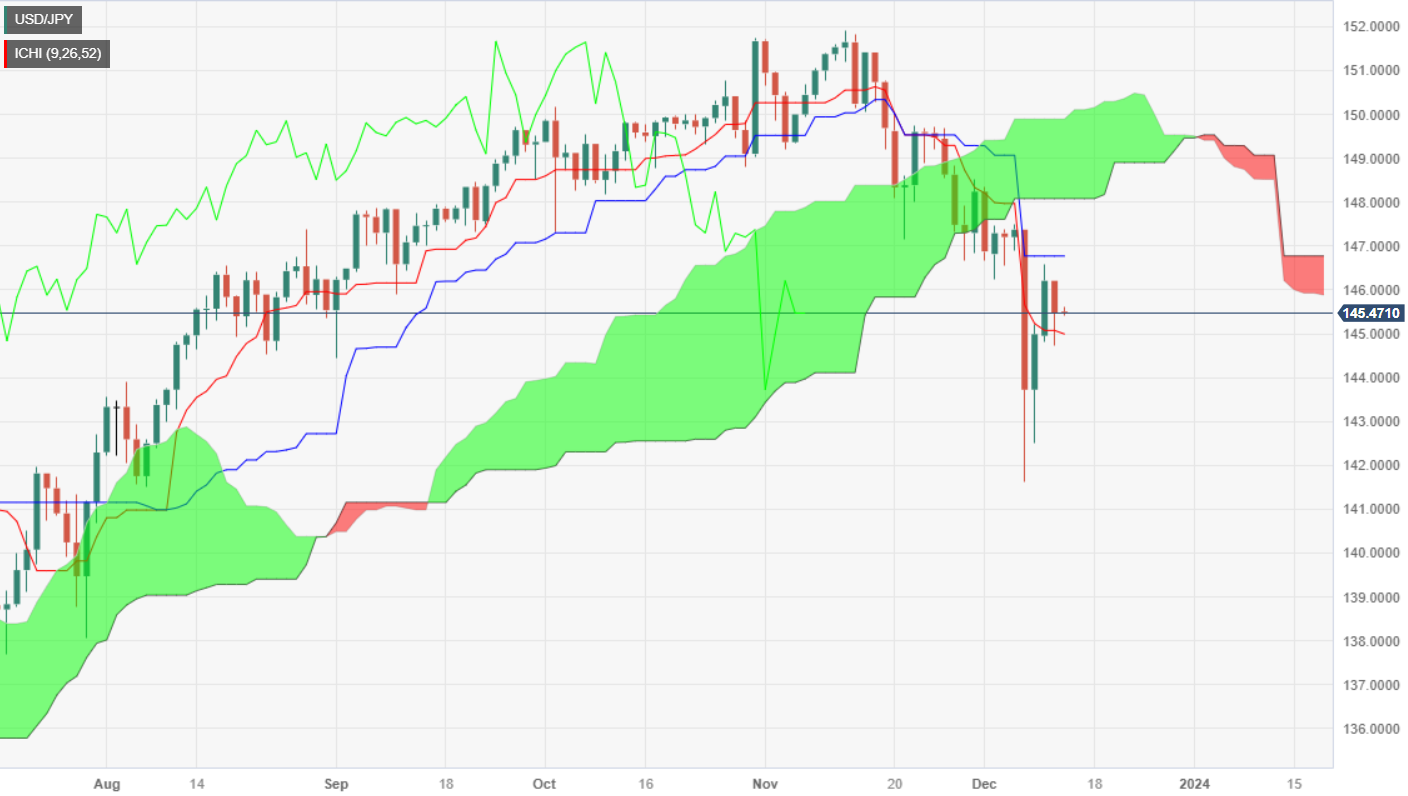 周二,美元/日元下跌 0.48%,因为美元/日元构筑看跌的孕线蜡烛形态,暗示美元/日元将延续下跌。发稿时,亚市开盘,美元/日元交投于 145.43,几乎持平。 美元/日元继跌破一目均衡云图等关键支撑