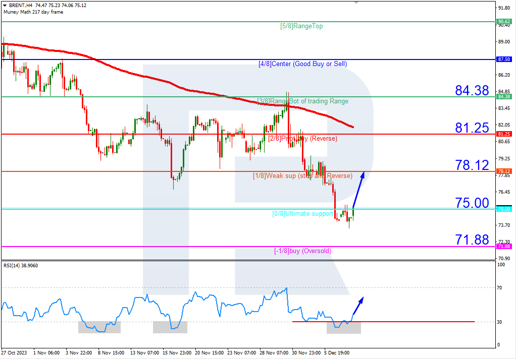 4小时图上,布伦特原油报价和RSI触及其超卖区域。在这种情形下,该工具料涨破0/8 (75.0),随后触及阻力线1/8 (78.12)。跌破 -1/8 (71.88)的支撑位该情形可能被取消。这种情况