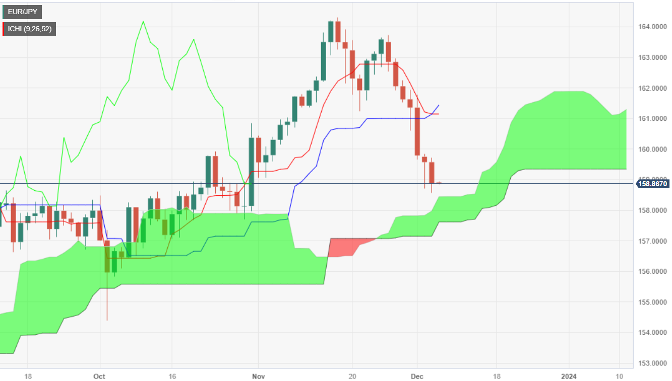 欧元/日元连续第七天扩大跌幅,徘徊在一目均衡图云图顶部大概在 158.89 上方,继触及日线高位 159.71 后下跌 0.36%。这一走势背后的主要驱动因素是市场情绪恶化,市场对日元避险地位的偏好升
