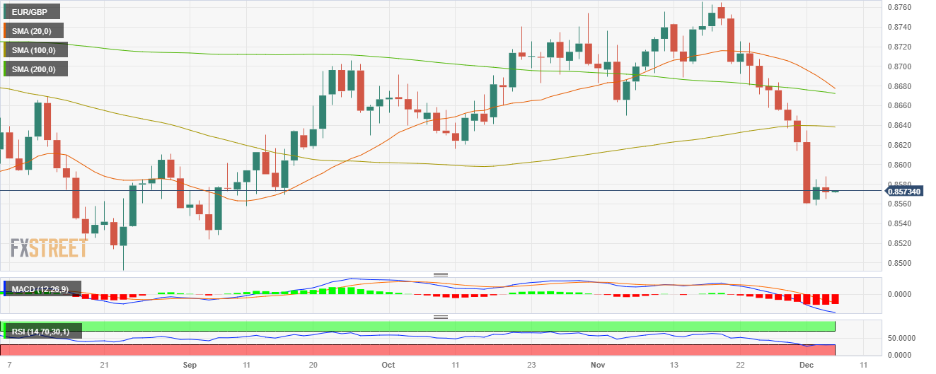 周二盘中,欧元/英镑温和回撤至0.8570区域。日图和4小时图显示,近期的抛售势头有所降温,短期前景倾向于中性至看跌。 日线图相对强弱指标深处负区,而MACD指标走出平缓的红柱,强化了看跌观点。此外