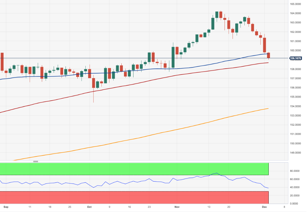 欧元/日元加速下跌,并在本周初测试 159.00 支撑位。 目前看来下行趋势仍将延续。在这种情况下,100 日均线 158.62 预计将在 10 月低点 154.34(10 月 3 日)之前提供暂时