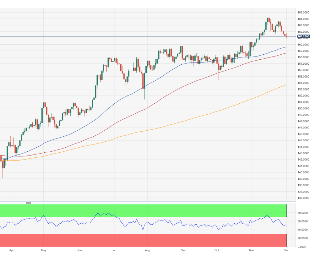 欧元/日元周五在161.30附近涨跌交替,延续了近期区间下限的盘整态势。 下行趋势的延续有可能促使该交叉盘跌破 160.00 整数关口,并重新触及位于 159.58 的 55 日均线。 到目前为止