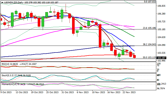 美元指数 美元指数周初保持看跌立场,并突破关键103.11/102.84支撑区的上边界(99.20-107.03反弹的50%斐波那契回撤位/11月21日触及的三个月低点/周图云底)。 上周五收盘低于2