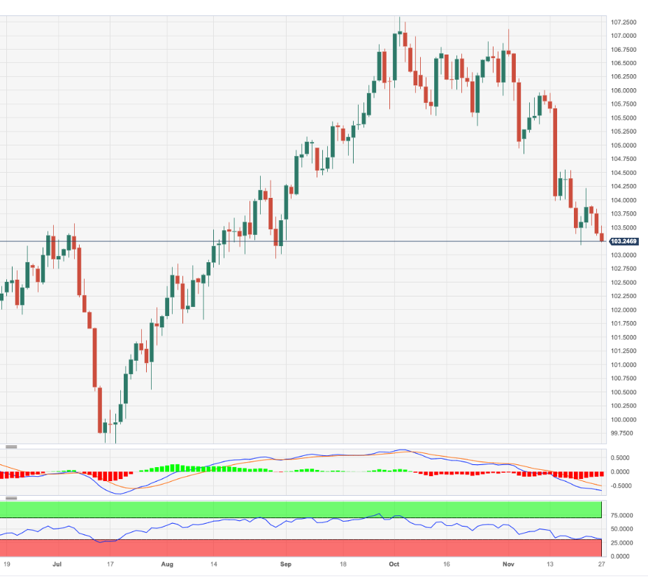 - 周一,DXY 将再次考验 103.00 区域。 - 失守该区域可能会进一步回调。 DXY连续第三个交易日回撤,接近本周初的三个月低点 103.00 附近。 如果卖方更加卖力,11 月低点