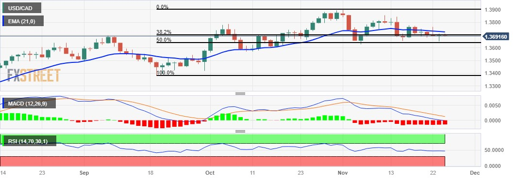 美元/加元削减日内涨幅,在欧洲时段交投于1.3690附近,周五加拿大将公布零售销售数据。投资者押注美联储(Fed)可能不会进一步加息,这可能会削弱美元/加元货币对的走势。 美元/加元货币对的技术指标