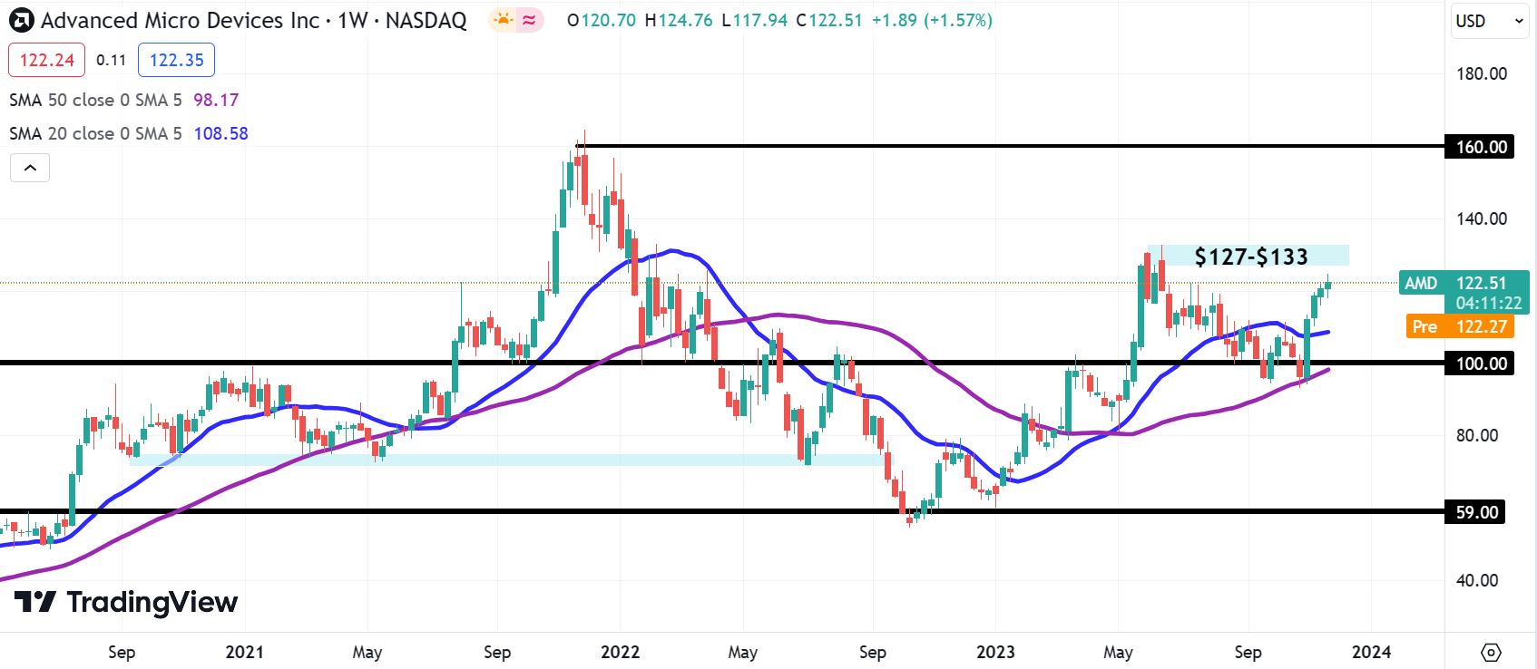 AMD股价连续第四周上涨。 标准普尔全球采购经理人指数显示,服务业表现优异,而制造业表现不佳。 AMD上周五开盘上涨,纳斯达克综合指数下跌。 5月和6月的127 - 133美元供应区域成为AMD股票主