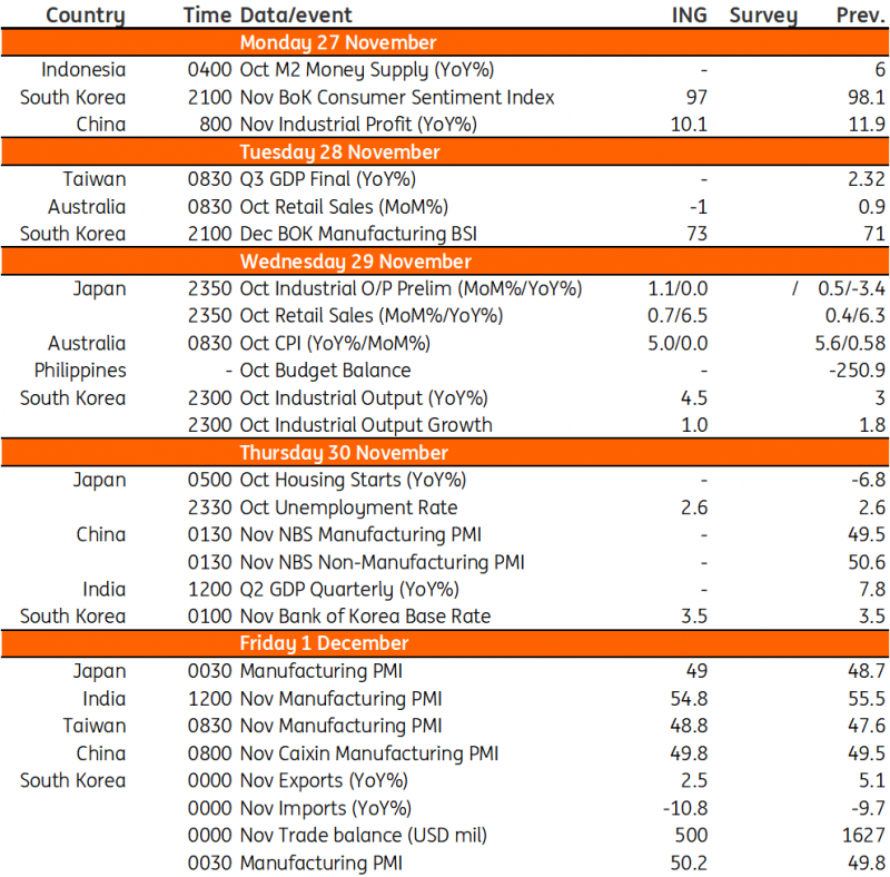 我们预计,由于对近期通胀再度加速的担忧挥之不去,韩国央行将在下周的会议上再次保持鹰派立场。我们还将看到中国的采购经理人指数、澳大利亚的通胀数据、印度第三季度的GDP数据,以及日本可能更乐观的数据。 中