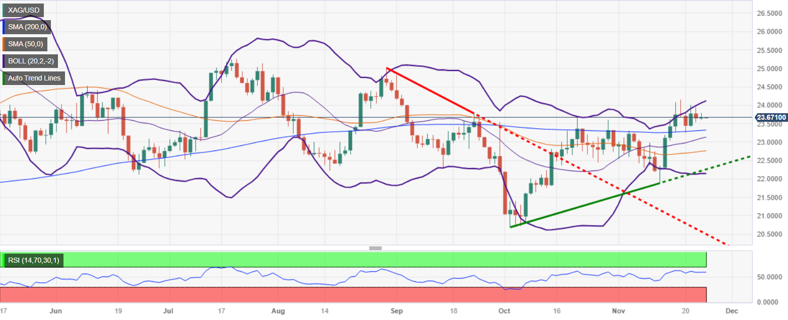 成交量低迷,白银价格周四上涨 0.91%,随着亚太时段的开始,银价交投于 23.82 美元附近,在周五早盘时段保持不变,因为日本和美国市场在假期后重新开市。 白银日线图显示,银价呈中性偏向上行,但仍