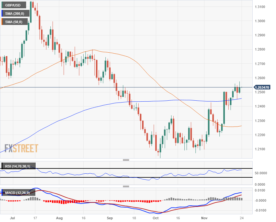 英镑/美元周四早些时候因英国采购经理人指数(PMI)意外上行而短暂触及十周高点,目前在1.2540附近紧密交投。 由于美国感恩节假期休市一天,货币市场的整体流动性和交易量严重下降,该货币对在本交易日
