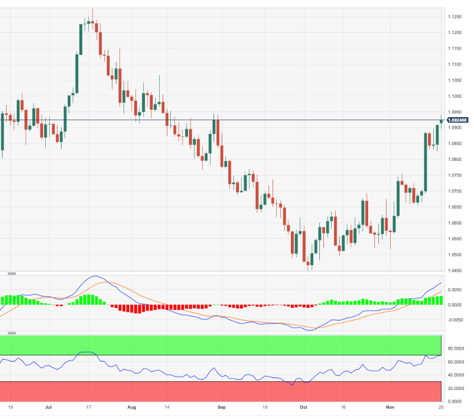 - 欧元/美元延续月度涨势,重新测试1.0940。 - 下一个上行目标是 1.1000 临界点。 欧元/美元继续保持乐观,本周初在 1.0940 附近创下三个月新高。 如果继续保持上行趋势,则本