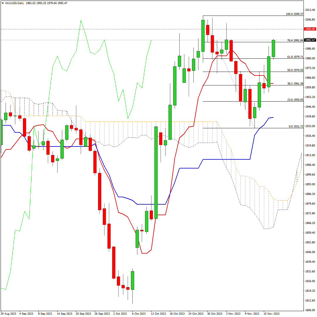由于市场对美联储紧缩周期接近尾声的憧憬推动了需求增长,黄金价格在周五升至十日高点,几乎完全收复了上周 2.7%的跌幅。 周五新一轮涨势突破了位于 1991 美元(2009-1931美元的76.4%回档
