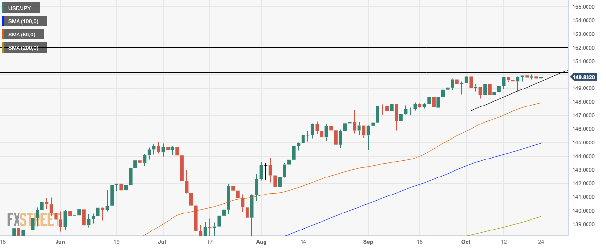 日元(JPY)兑美元(USD)周二小幅上涨,美元/日元从疲软的开局中回升,回到了熟悉的区域,略低于关键的 150 水平。趋势向上并倾向于延伸,突破直角三角形的威胁提供了看涨的技术线索。 日本央行(B