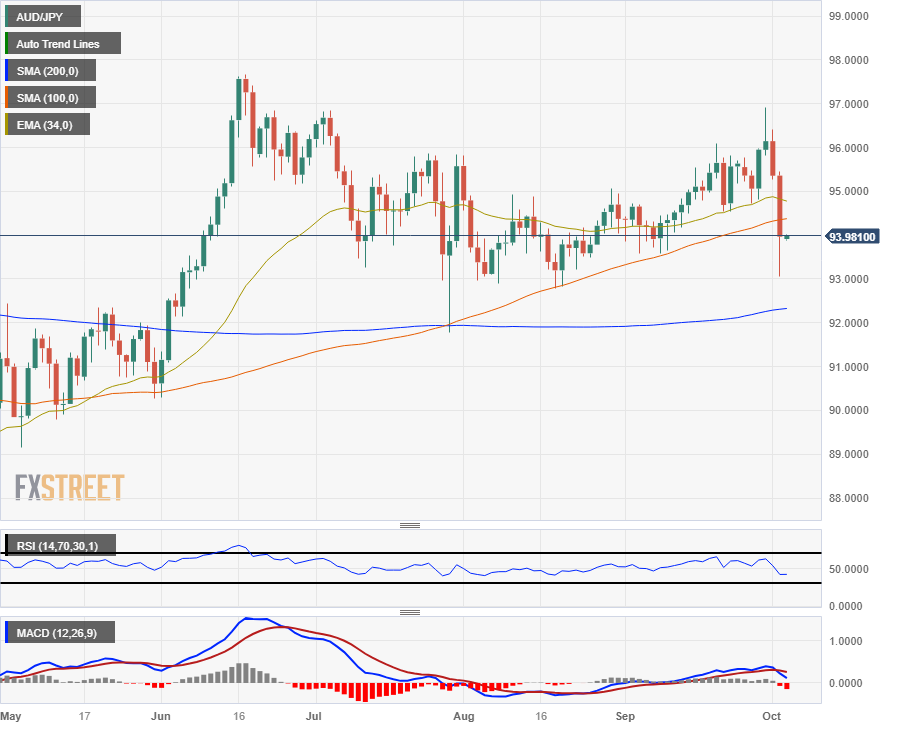 消息指日本央行进行外汇干预后,澳元/日元自近期高点大幅下跌,交投于 94.00 下方