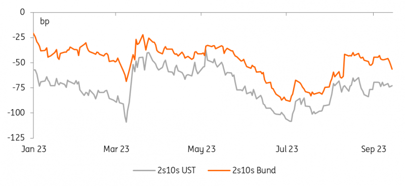 欧洲央行(ecb)已进入下一个阶段——利率市场的目光开始越过峰值,宏观经济方面的担忧指引利率走低,收益率曲线趋平。这与美国形成鲜明对比,在美国,宏观弹性给美联储带来了鹰派的尾部风险,但目前也逐渐推高了