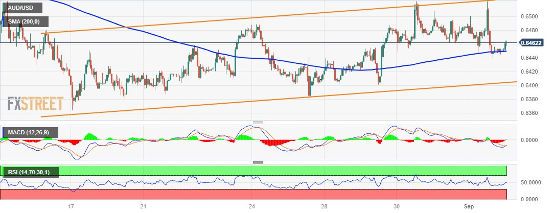 澳元/美元在周一亚市触及的四日低位0.6440附近吸引了一些逢低买盘,并停止自上周从0.6520区域或8月11日以来最高水平的小幅回撤。澳元/美元目前交投于0.6465附近,日内涨幅略大于 0.10%