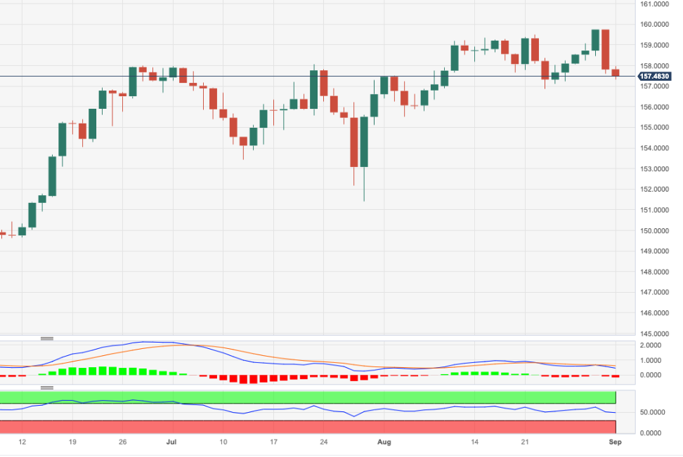 进一步的抛售压力迫使欧元/日元扩大周四跌幅,周五在 157.30 附近创下多日低点。 如果下行趋势加快步伐,欧元/日元有可能初步跌至周低点 156.86(8 月 23 日)的次要支撑位,目前看来该支