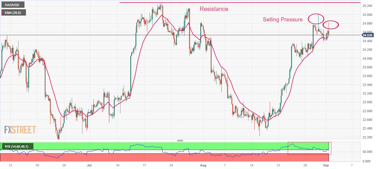 银价(XAG/USD)在 24.50 美元上方呈现震荡走势,因为投资者正在仔细研究美国 8 月份的非农就业(NFP)数据。美国劳工统计局报告称,新增就业人数为 18.7 万,超过预期的 17 万,并下