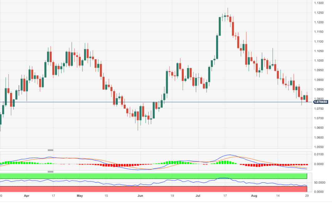 欧元/美元周二至1.0800关口上方的早些时候看涨尝试有所消退。 如果空头重新占据上风,货币对可能跌回 8 月低点 1.0765(8 月 25 日)。从这里往下会跌至 5 月份低点 1.0635(5