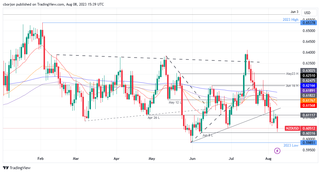 纽元/美元大幅滑落至0.6100关口下方,此前中国数据显示该国解除Covid-19限制后经济复苏乏力,引发投资者担忧。因此,交易商对美元(USD)的避险地位做好了准备,这给纽元/美元带来了阻力,在触及
