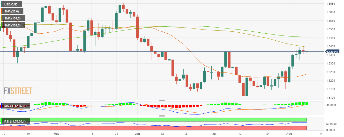 周一尾盘,美元/加元在 1.3395 的 100 天简单移动均线 (SMA) 遇阻后,维持中性收于 1.3370 区域。一方面,美元因美债收益率上升而走强,而油价下跌则限制了加元的升幅。 本周一,没